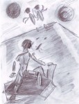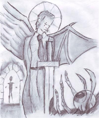 So when I started just drawing for the sake of it, I came up with this on the right. Again the iconography and themes of the art is all Lost Heroes. I like the composition of the piece though I think it might have worked a lot better using ink instead of pencil/charcoal. Though charcoal is fun to use, dirty and messy and getting your hands into the piece. This piece on the right shows a much earlier incarnation of the same idea. I don’t know if I have “improved” since then, but I do enjoy more.