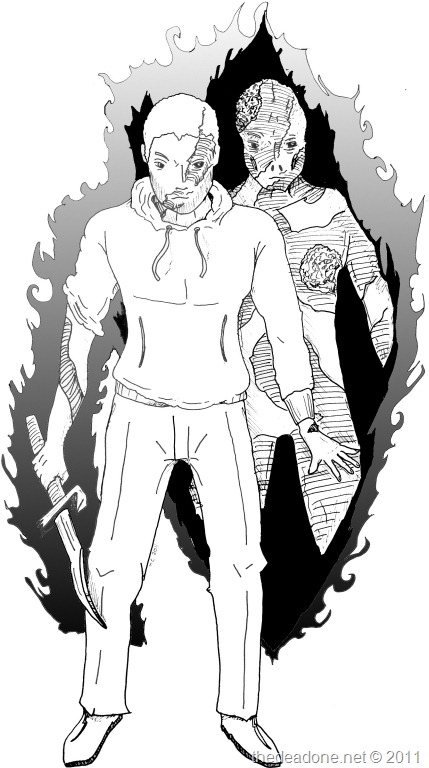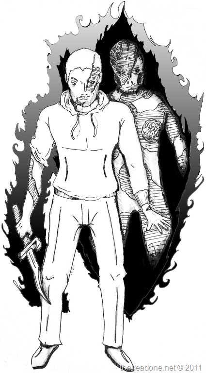 So this is Matthew, a Renegade Chosen. His body and face are covered in scars where he pulled himself together in the Void. His knife is actually the remains of a sword that he created while in the Void. It burned and melted away as he cut his way back to Earth. The knife allows him to make quick short trips into the Void and travel instantaneously to other places. However there is a darkness to his power, a manifestation of his power in the Void, a shadow.
