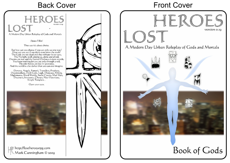 I took a short break from working on Lost Heroes RPG and end up working on Lost Heroes RPG! Swinging from writing to graphics and layout. I just started playing around with ideas on paper for the front cover of Lost Heroes as a book and ended up taking it to the end.