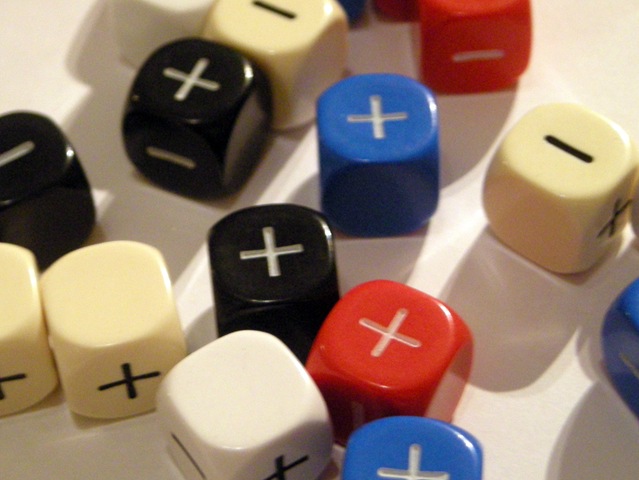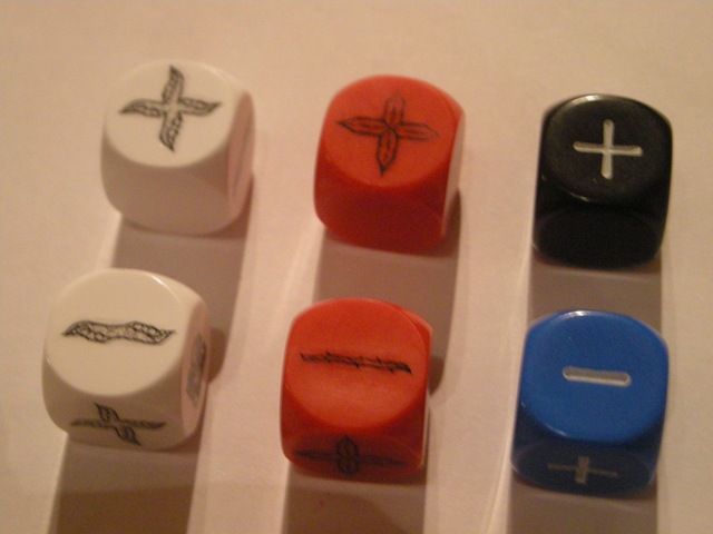 Visually there is certainly no problem in picking out pluses and minus when you roll a bunch together. In fact I think it’s easier, the pluses and minuses on the printed dice are bigger, check out the slightly fuzzy photo below: