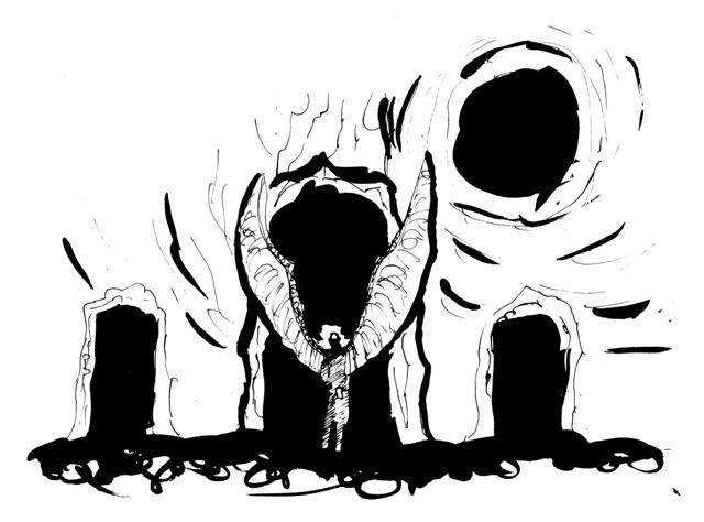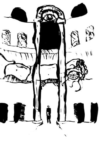 The interesting thing is that I took advantage of the effect scanning has on the image, by only scanning in black and white, it hid any mistakes or smudges, leaving a sharp and pure black ink image. I even played with different ways of using ink: brush, nibs, pens and even markers. I’m not sure how recognisable the differences are in these few images.My host’s recent downtime gave me spare time to actually do some artwork, and I played with the technique a bit. I needed to know if I could use it to do urban scenes, which was meant to be part of the theme for L___ H_____. So I took a photo of a city street and added an old friend…