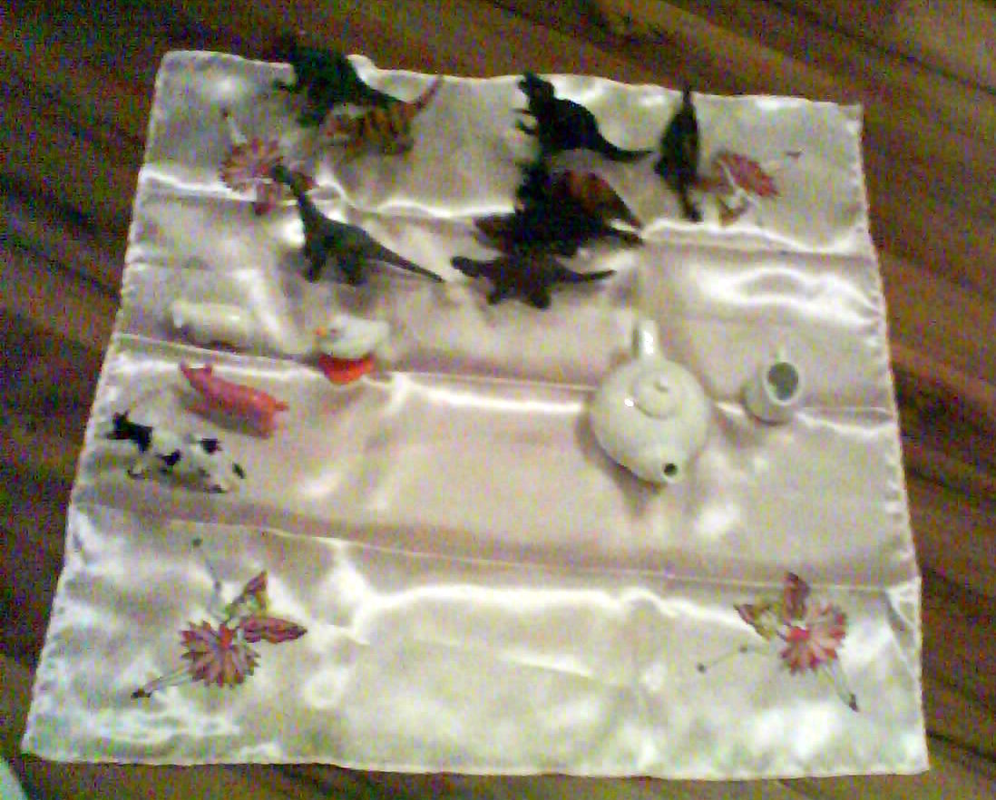Your daughter has fine taste in table linens too, I see. I’m sure the saurian guests appreciate the elegance of satin under their claws.
