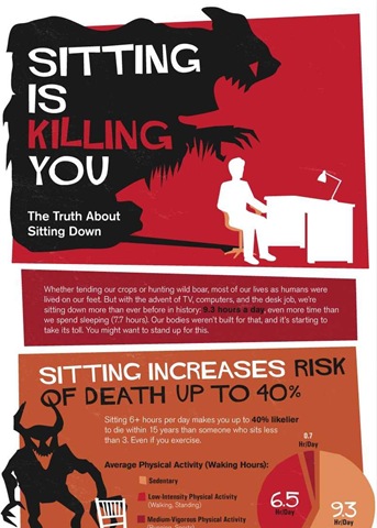 A few other things have been percolating in my mind as well. I’m sure many of you have already seen the “sitting is killing you” infographic where it extols the terrible dangers of sitting. Made me think of how sitting in my favourite chair (which I loving now think of as my seat of DOOM!) in the evening, my body just turns off, leaving me, at best, to watch TV, or at worst, troll the internet from my laptop. I can’t write when I hit that seat in the evening, I’ve tried.